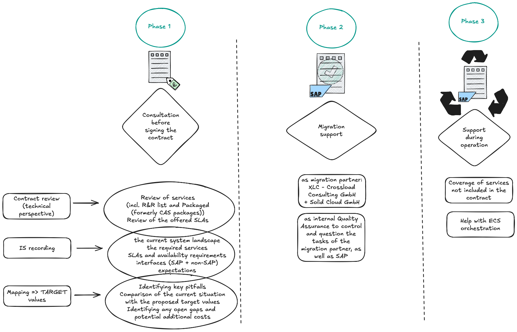 The challenge lies in selecting the right package for your business from the wide range of services offered, ensuring you achieve at least the same level of service as with your existing setup. Hidden costs, appropriate SLAs, and a sound exit strategy are just a few of the crucial factors to consider. We help you understand the fine print. Only then can you make informed comparisons and confidently sign a contract.
